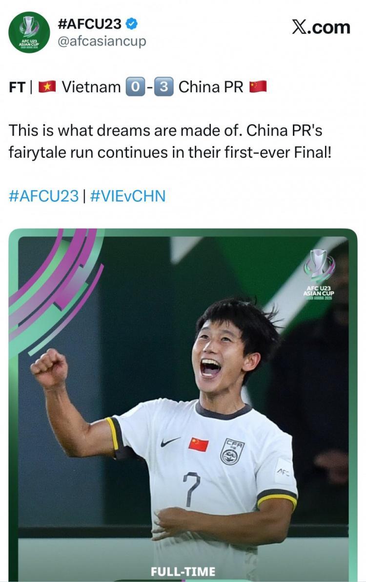 U23亚洲杯半决赛,中国男足3比0战胜越南。